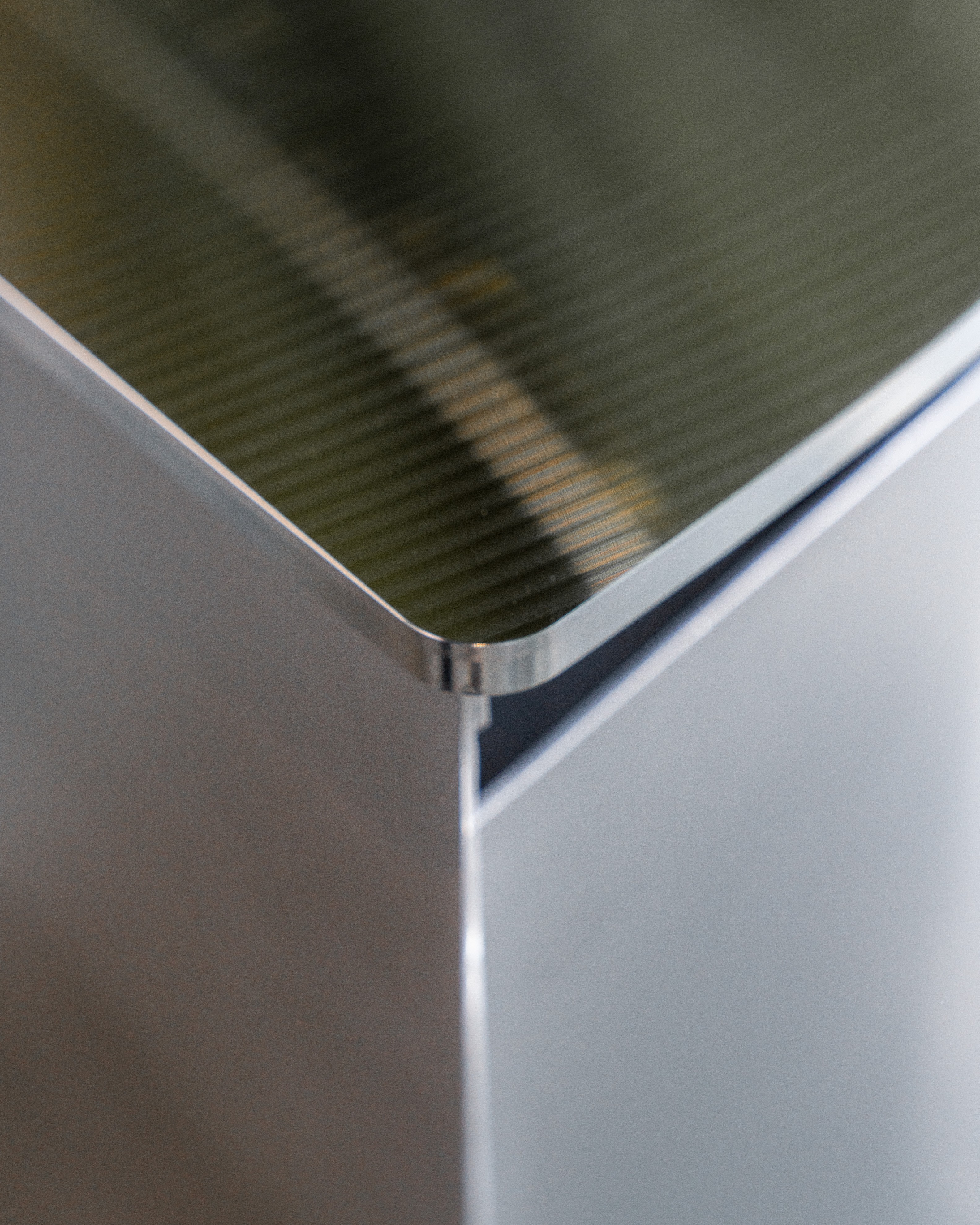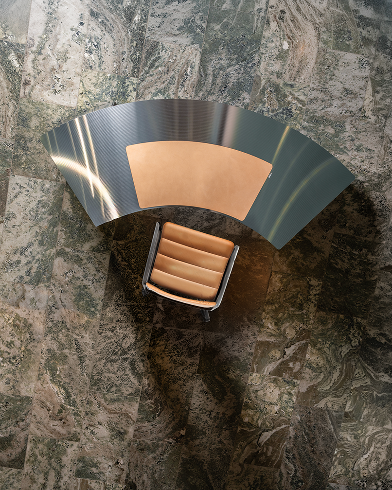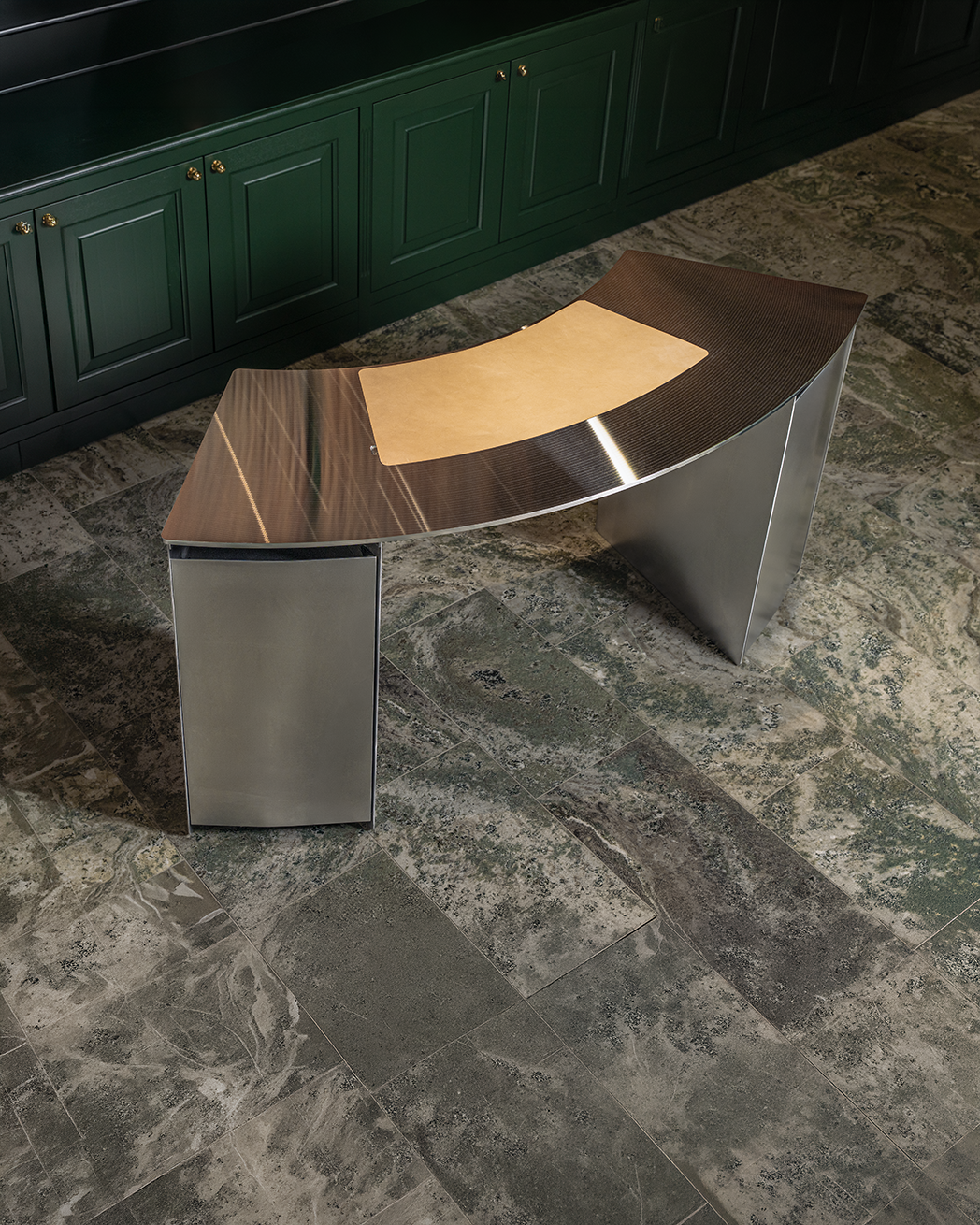 The tabletop is machined from solid aluminum and milled with a precise pocket to house a leather inlay from Tärnsjö Garveri, sitting completely flush with the surface. The contrast introduces a softer, tactile workspace within a rigid metal frame.