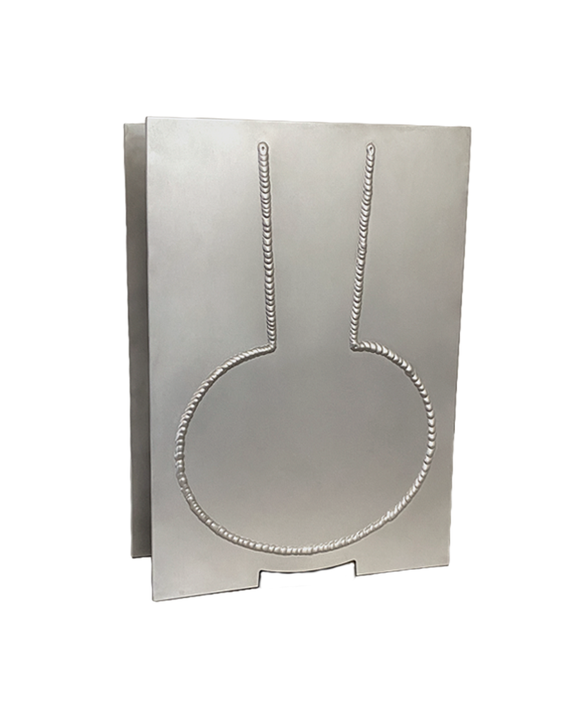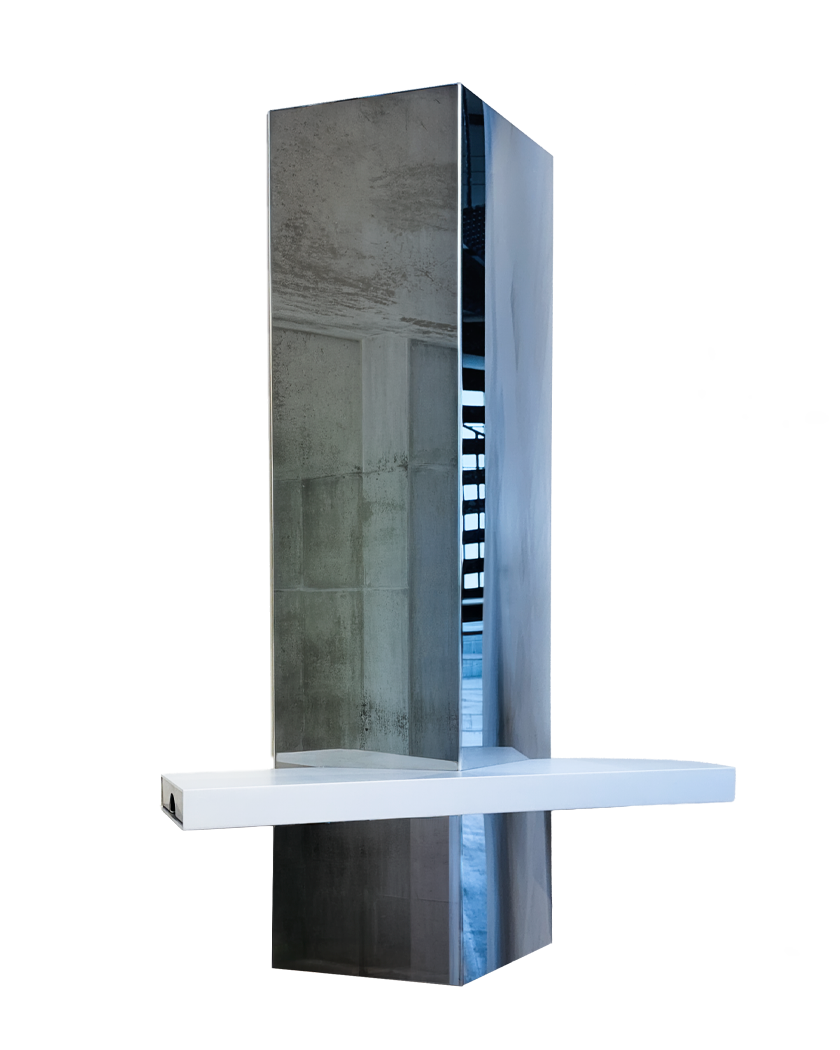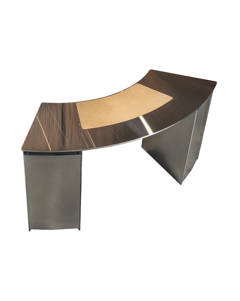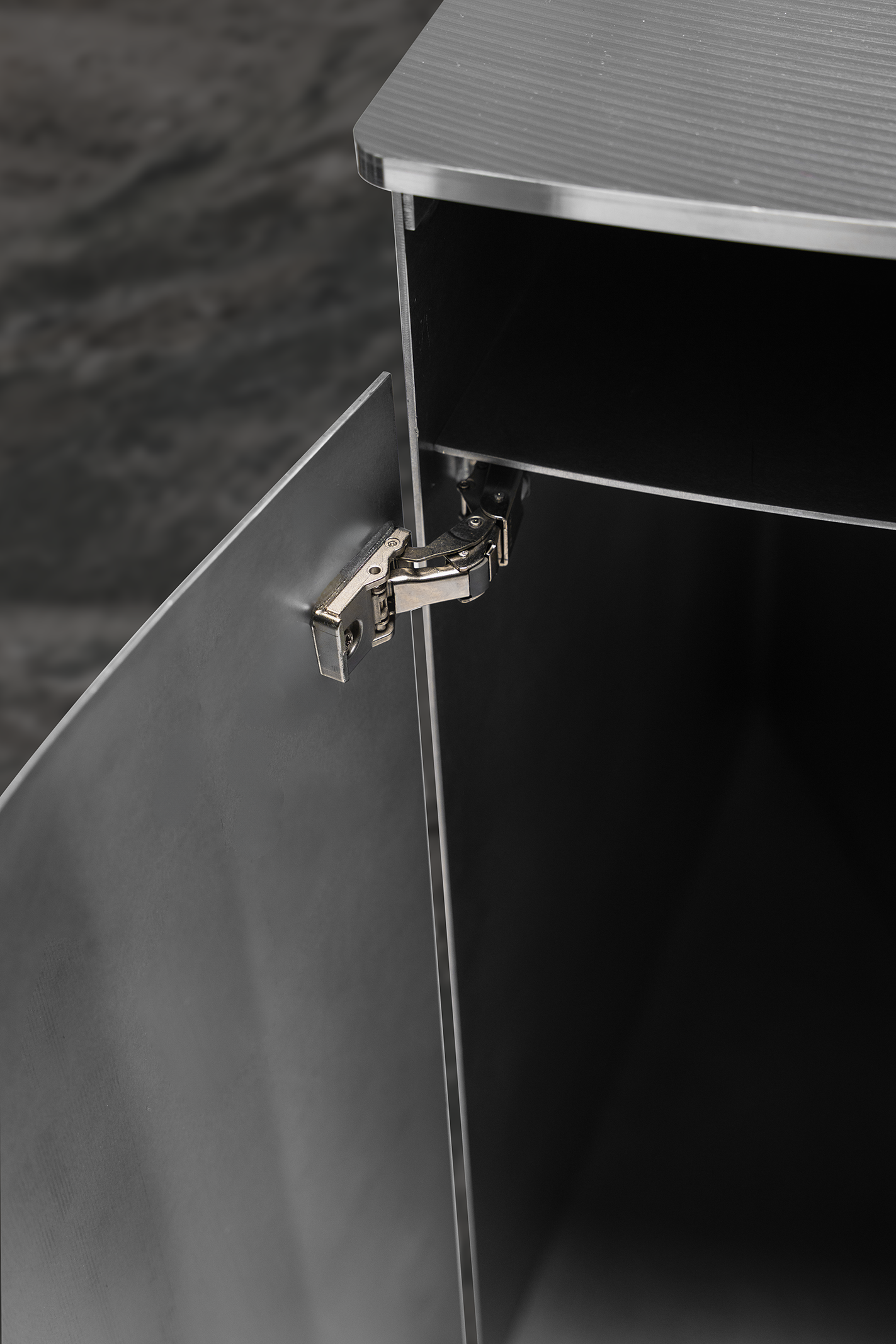 Two aluminum cabinet legs define the structure while integrating storage, keeping the silhouette clean and functional from every angle.