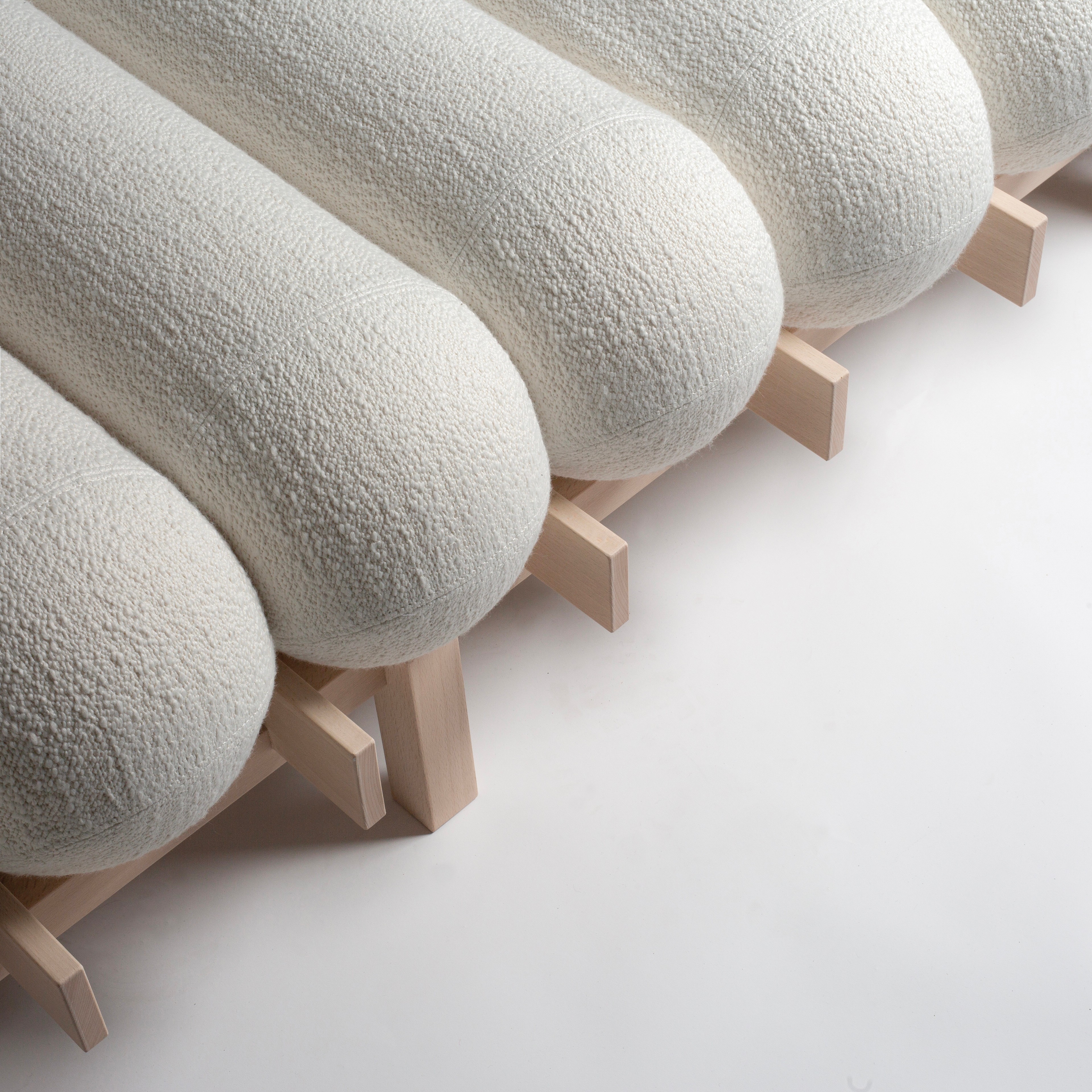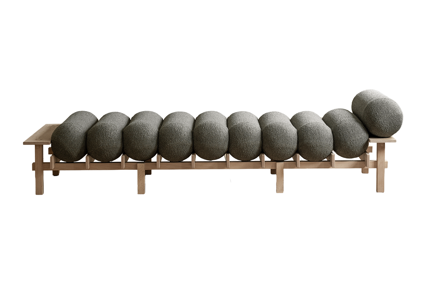 The padding swells through the openings of the wooden frame while the back remains stripped back and expressive. This contrast between the soft upholstery and the precise wooden structure defines the character of the piece.