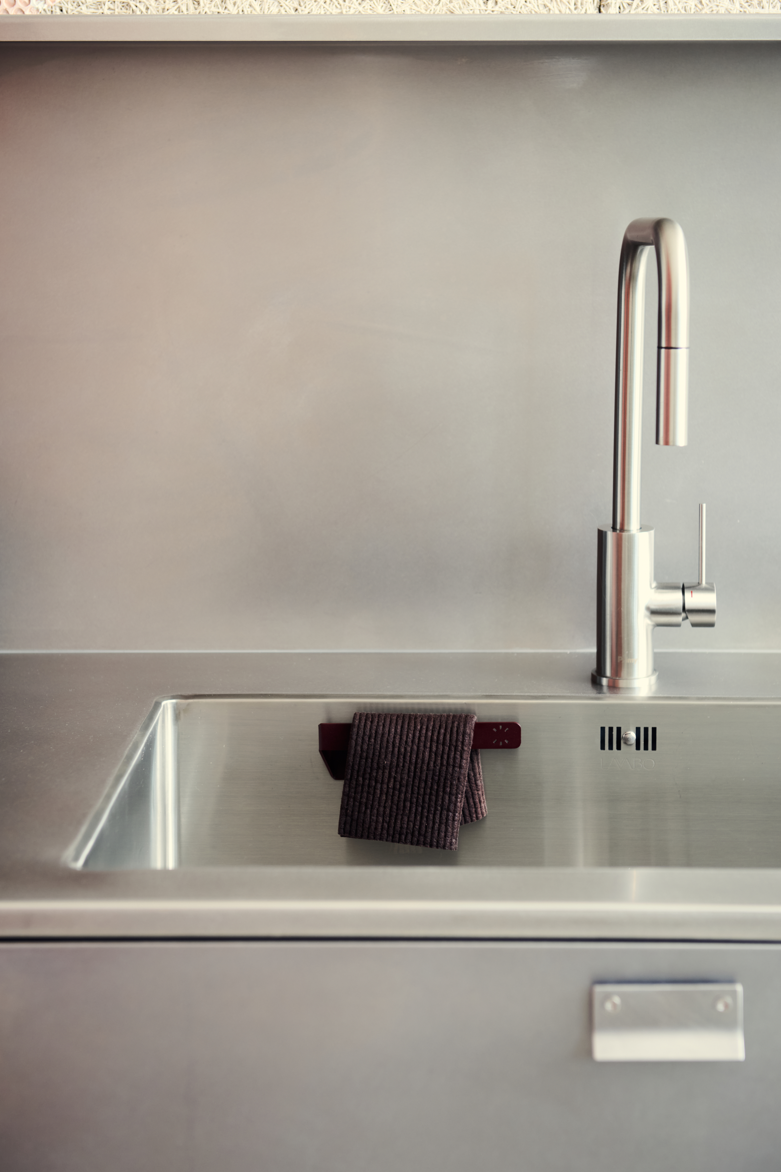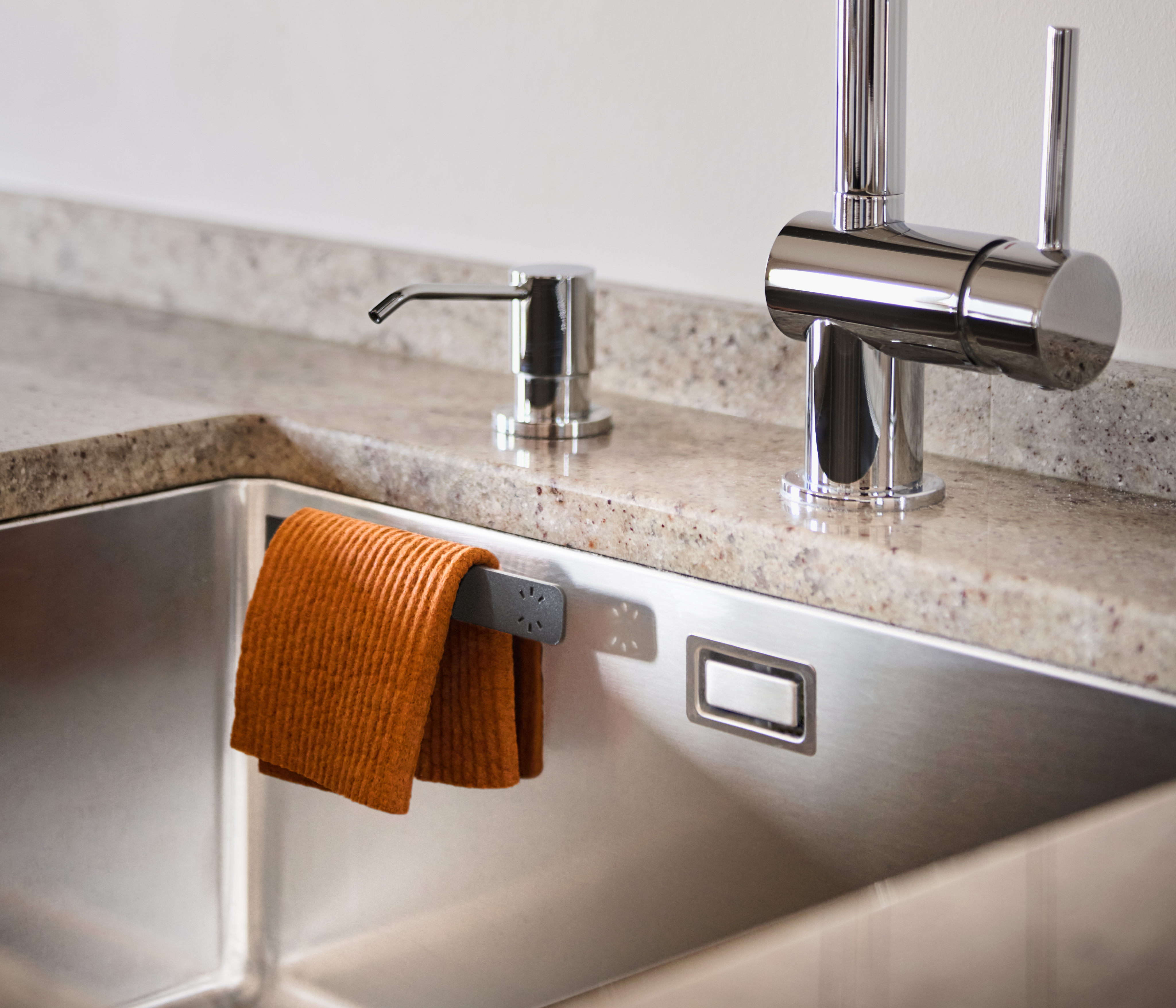 The Magnetic Hanger was designed as a simple solution for storing and drying a dishcloth directly inside the sink. By using a magnet placed on the outside of the sink, the holder attaches through the steel without any drilling or permanent installation.