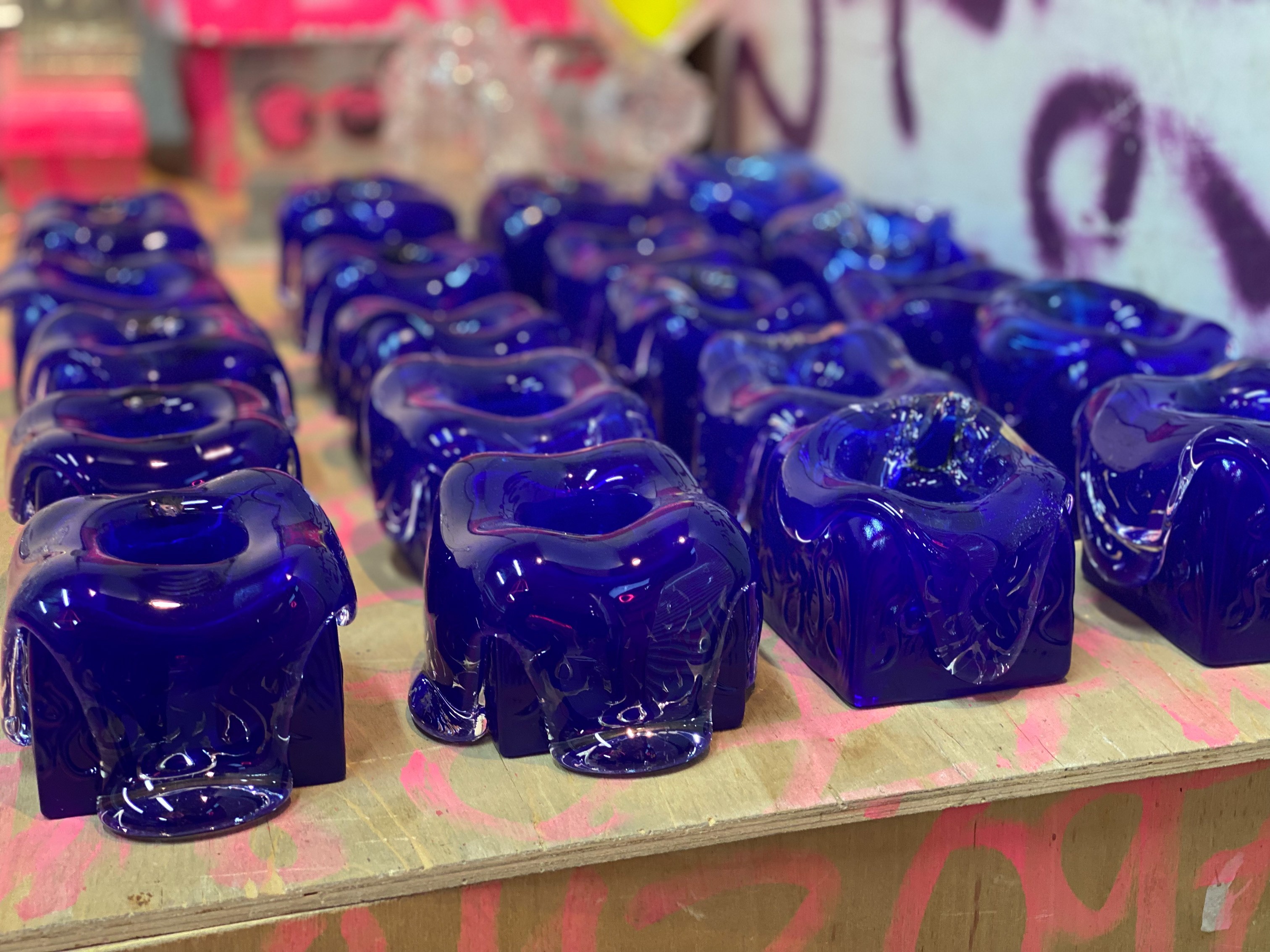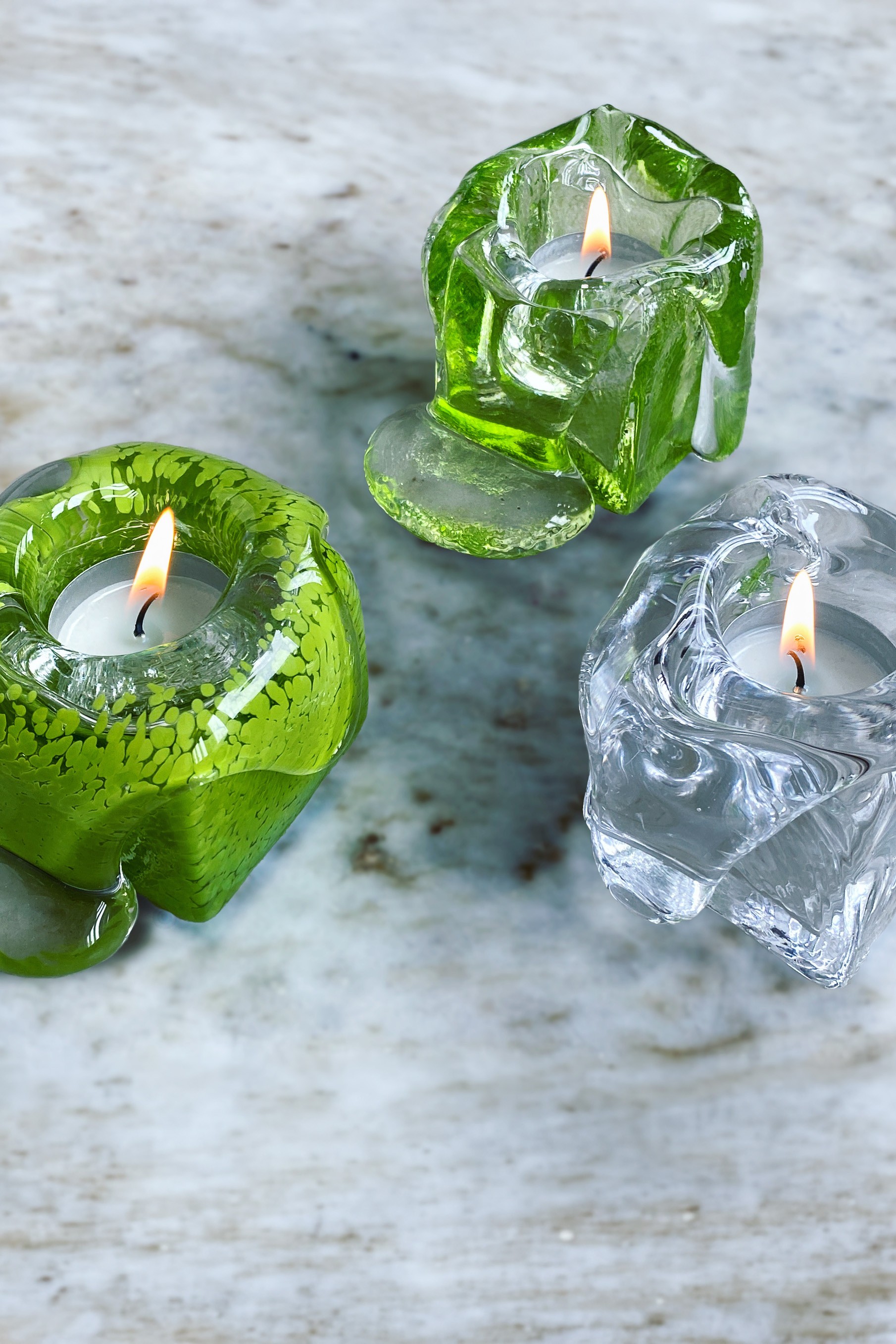 The form allows the molten glass to flow and stretch during production, creating soft, dripping shapes that emphasize the movement of the material. Each piece captures a moment from the glassblowing process, making every candle holder slightly unique.